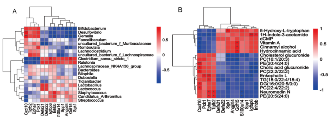 Clostridium_sensu_stricto_1 和 Ralstonia 與 Igfbp6 和 Gdf15 呈正相關,與 Epha7、Pck1和Cxcl10 呈負相關。此外,Defa21和Defa22與uncultured_bacterium_f_Muribaculaceae呈負相關(圖7A)。DEGs與代謝物的相關分析結果表明,H-吲哚-3-乙酰胺與Igfbp6和Inhbb水平呈顯著正相關,與Epha7呈負相關。代謝產物5-羥色胺與SGK1呈顯著正相關。維生素A、肉桂醇和氫肉桂酸與GDF15呈顯著正相關,與CxCl10呈負相關。代謝產物PC、PE、TG、DG、腦啡肽L、NeuroMedin N、膽酸葡萄糖醛酸苷和膽固醇葡萄糖醛酸苷與CxCl10、Pck 1、Epha7和Tgfb2呈顯著正相關,與Inhbb、Igfbp6、S100a14、GDF15、ANGPTL4和SGK1呈負相關(圖7B)。
