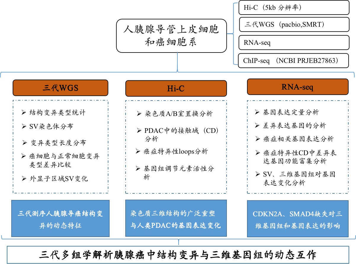 結構變異(SV)是基因組變異的來源之一,并可能導致癌基因生成。然而,人類癌癥中SV的識別和解釋在技術上仍然具有挑戰性。利用長讀長測序和Hi-C優勢檢測人類胰腺導管上皮癌發生結構變化的特征,揭示了3D染色質架構的廣泛重新編程,對闡明胰腺癌基因組結構變化特征對其發生發展的分子機制至關重要。