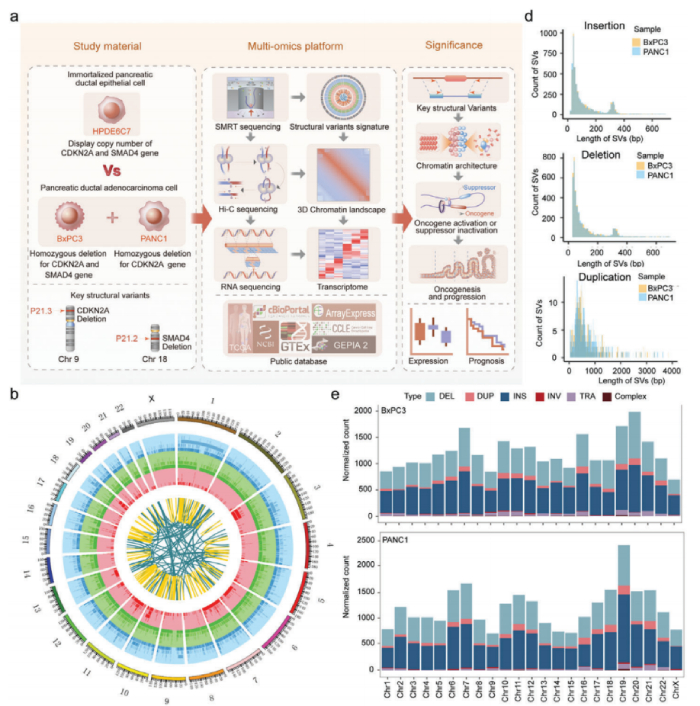 研究人員通過整合三代人重測序、高通量染色質構象捕獲( Hi-C) 和 RNA-seq等多組學技術,對源自人胰腺導管上皮的胰腺癌細胞和正常人胰腺導管上皮細胞進行了深入研究和綜合分析,成功揭示了PDAC細胞中SV的特征圖譜和染色體空間結構的多尺度重塑,并進一步闡釋了SV與染色質三維結構之間的復雜的相互作用及其對基因表達的影響。這一發現為全面了解SV在胰腺癌發展中的致病機制提供了全基因組資源和新的空間視角,這可能有助于識別新的預后標志物和治療靶點。