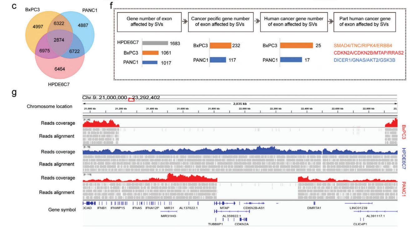 研究了在其外顯子區域受到SV直接影響的基因,并分別在PANC1、BxPC3和HPDE6C7中檢測到了1017、1061和1683個基因的變化。在PANC1中獨立檢測到14號染色體上的DICER1擴增,19號染色體上的AKT2缺失和20號染色體上的GNAS插入。在BxPC3中特異性地檢測到9號染色體上的TNC缺失,11號染色體上的RRAS2插入和18號染色體上的SMAD4缺失。BxPC3樣本中還存在許多基因大片段缺失,長度超過1.7 Mb,包括CDKN2A、CDKN2B、MTAP和DMRTA1等基因。基于長讀長測序結果建立了人類胰腺癌中SV的特征,為全面研究SV在這種致命惡性腫瘤中的發病機制提供寶貴的資源。