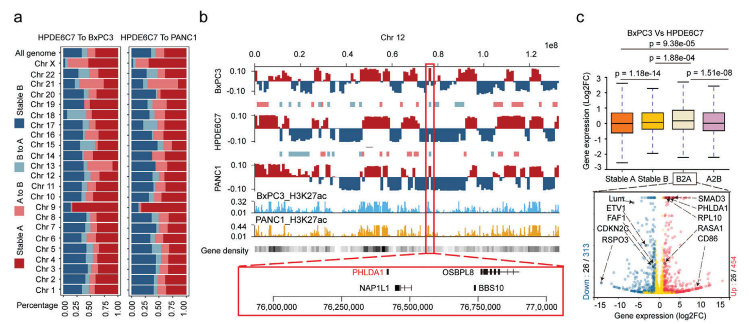 PADC中染色質A/B室置換分析,與正常細胞相比,BxPC3中A/B置換的總發生率分別為24.8%(A到B,15.3%;B到A,9.5%)和PANC1中的24.1%(A到B,16.2%;B到A,7.9%)。A/B置換與基因密度和調節活性的變化有關,穩定的A和B室到A室置換是具有活性轉錄的基因豐富的區域,而穩定的B室和A室到B室置換具有相反的特性,RNA-seq數據相結合也證實這一結論。其中癌癥樣本中PHLDA1是位于12號染色體共同B到A室置換的基因,在兩個癌細胞系中都顯著上調,PHLDA1在幾種惡性腫瘤中顯著上調,包括胰腺癌、低級膠質瘤和黑色素瘤,它與胰腺癌預后不佳顯著相關。這些結果表明兩個癌細胞系(BxPC3和PANC1)中染色質A和B室的空間分布發生了變化,這些轉變與癌癥相關基因的表達變化顯著相關。