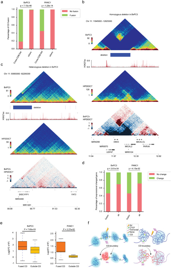 分析了兩個癌細胞系中CD融合與差異基因表達之間的相關性。結果表明,融合CD中差異表達基因的比例明顯高于基因組其他區域,總的來說,這些數據表明,癌癥特異性SV可以通過重塑PDAC中的CD來調節基因表達。