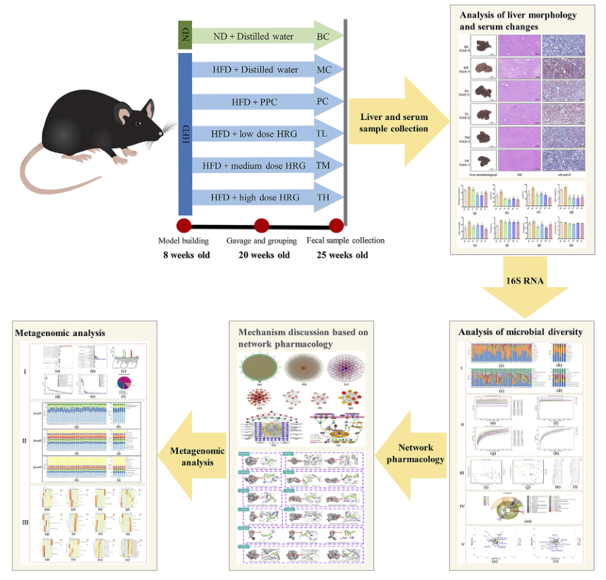 綜上所述,HRG可能通過改變微生物多樣性、結構和功能來改善高脂飲食誘導的NAFL。還有可能通過調節腸道相關的代謝途徑、炎癥反應和免疫反應來改善NAFL相關的脂肪堆積和肝臟損傷。這些結果有力地表明,HRG可能通過預防腸道菌群失調來減輕NAFL。此外,HRG可通過腸道菌群治療多種成分、多代謝途徑、多靶點的NAFL。本研究為NAFL的治療提供了新的思路,證實了腸道菌群與NAFL之間的關系,提示HRG具有良好的治療效果。