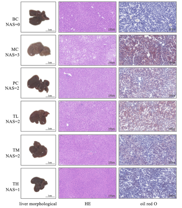 如圖1所示,與BC組相比,模型組大鼠肝臟脂肪堆積增多,肝臟體積增大,顏色變白,邊緣變鈍。給藥后,各組大鼠肝臟紅化程度均有不同程度的改善,尤以TH組為佳。HE和油紅O染色結果顯示,模型組大鼠肝組織內可見較多的球狀變性肝細胞和較多的紅色脂肪,而給藥組較少。MC組病理程度重,TH組輕,TL組與PC組之間無顯著差異。因此,HRG可改善HFD誘導的肝臟脂肪堆積和體重增加,并且可能以劑量依賴的方式改善肝臟損傷。
