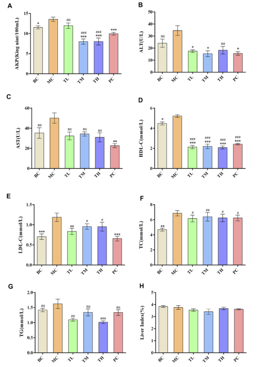 TM組和TH組降低AKP效果優于TL組,TG組降低AKP效果優于TM組。PC組降低AKP的效果優于TL組,但差于TM組和TH組。PC組降低低密度脂蛋白膽固醇的效果優于TM組和TH組,表明高脂飼料可導致大鼠血脂和肝酶代謝異常,高脂高脂顆??筛纳聘咧笫笱x和肝酶活性。與陽性藥物相比,HRG在改善高密度脂蛋白膽固醇、甘油三酯、堿性磷酸酶方面具有優勢,且改善程度可能呈劑量依賴性。各組間器官指數無顯著差異,HRG對小鼠生化指標和器官指數的影響如圖2所示。