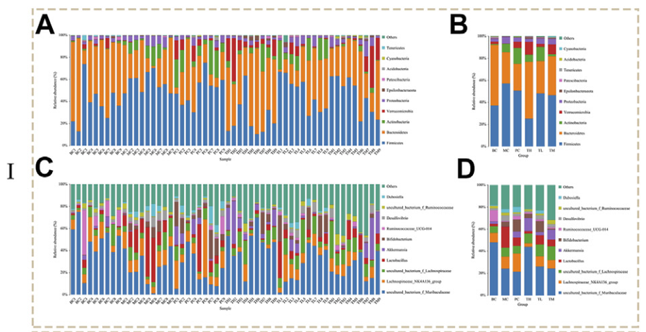 對糞便樣本進行16s rRNA基因測序分析,在門、綱、目、科和屬的水平上對微生物群進行了鑒定和分析,最終共鑒定到17門、26綱、56目、86科、187屬。主要物種為厚壁菌門和擬桿菌門,其次是放線菌門、疣微菌門和變形菌門。此外,物種主要分布在uncultured_bacterium_f_Muribaculacea屬和lachnospiraceae NK4A136 group,其次是uncultured_bacterium_f_Lachnospirae、Lactobacillus和Akkermansia。