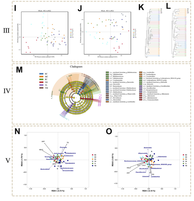腸道菌群聚類顯示BC組和MC組樣本微生物群落差異明顯,給藥組、BC組和MC組微生物群落差異顯著。此外,Bray-Curtis PCoA 證實了這些發現(圖 3J)Curtis PCoA 證實了這些發現(圖 3J)。 PC1(15.21%)能較好地區分BC和MC組、MC和TM、TH組微生物群落。這些數據進一步表明BC和MC組在微生物群落結構上存在較大差異,并且HRG施用組和對照組在微生物群落結構上存在較大差異。