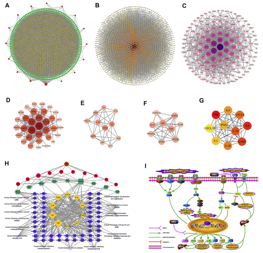 (A)HRG藥材靶點網絡。(B)與NAFL有關的PPI網絡。(C)與IFD有關的PPI網絡。(D)HRG-IFD-NAFL合并目標的PPI網絡。(E)模塊1(F)模塊2(G)Hub基因。(H)草藥-關鍵化合物-潛在靶向途徑網絡。(I)關鍵靶點可能導致的關鍵生物進展圖例。