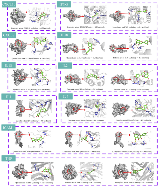 利用10個關鍵治療靶點、14個關鍵化合物和相關通路,通過Cytoscape構建了“藥草-關鍵化合物-潛在靶點-通路”的網絡圖(圖4H)。排名前三的化合物被選為潛在化合物(槲皮素、木犀草素、山柰酚)。選擇前三個信號通路作為關鍵通路。繪制了 HRG 通過腸道菌群治療 NAFL 的通路機制(圖 4I)。將10個關鍵靶點與3個潛在化合物進行分子對接,共獲得18對對接結果(表4),使用 Pymol 可視化結果(圖 5)。