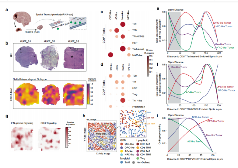 為了確定?T?細胞簇的空間位置信息,以及與特定腫瘤狀態共定位信息,作者進行了空間分辨轉錄組RNA測序(stRNAseq)。該團隊收集3名原發性GBM IDH1/2 Wt患者組織樣本,數據集總共包含2352個測序點,每個點的中位數為8個細胞(范圍:每個spot點捕獲4~22個細胞)。作者通過NMF回歸和Moran統計分析,發現CD8+T細胞簇與GBM亞型相關聯,腫瘤區域富集為間充質樣腫瘤(MES樣),星形膠質細胞樣(AC樣)轉錄特征與活化的CD8+效應子、CD8+T耗盡簇共定位。