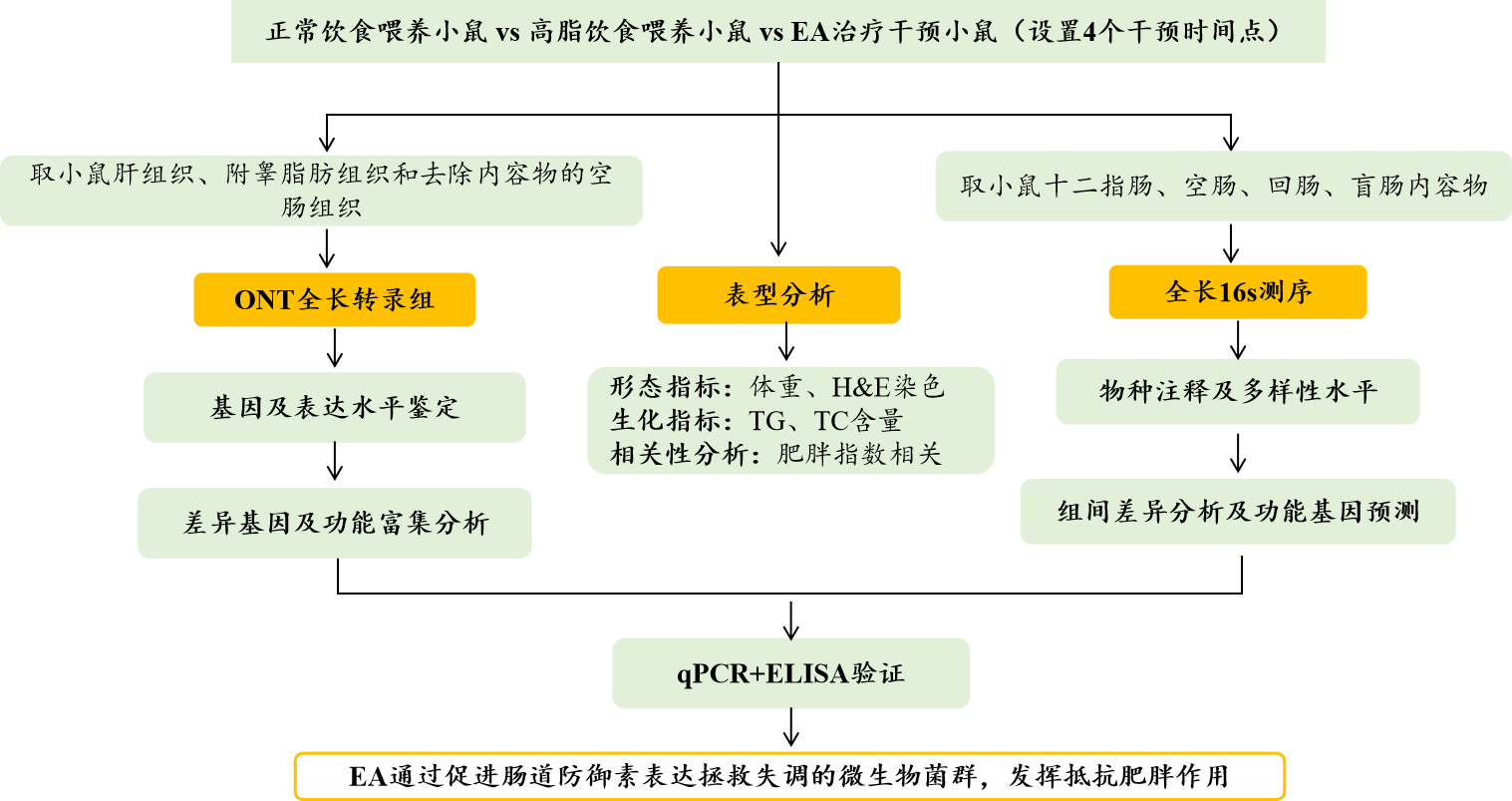 肥胖作為一種不斷增長(zhǎng)的非傳染性流行病,影響了超過(guò)20億人。腸道微生物菌群失調(diào)已被證明是肥胖和肥胖相關(guān)疾病發(fā)生和進(jìn)展的關(guān)鍵因素,包括高血壓、II型糖尿病、血脂異常和非酒精性脂肪性肝?。∟AFLD)。針灸已被廣泛用于治療肥胖癥,研究報(bào)道,電針(EA)可以減輕肥胖小鼠的體重,挽救生態(tài)失調(diào)的腸道微生物群,還可以調(diào)節(jié)免疫力。然而,EAEA重塑腸道微生物群的潛在機(jī)制尚不清楚,如何通過(guò)腸道微生物菌群調(diào)節(jié)腸道先天免疫力對(duì)抗肥胖仍有待闡明。