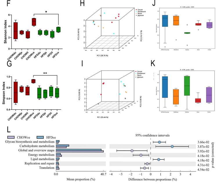 α多樣性分析結(jié)果顯示,高脂飲食HFD組與正常對(duì)照組的十二指腸、空腸和回腸微生物多樣性沒(méi)有顯著差異,但在盲腸中HFD組微生物多樣性顯著減少(圖1F, 1G);β多樣性分析結(jié)果顯示,與其他腸道段相比,只有盲腸微生物菌群在HFD組與正常對(duì)照組表現(xiàn)出顯著差異(圖1H, 1I);此外,top 15的KEGG通路中有7個(gè)是基于微生物功能富集,高脂飲食組盲腸微生物的上調(diào)通路包括脂質(zhì)代謝、碳水化合物代謝和聚糖生物合成和代謝,下調(diào)通路包括能量代謝相關(guān)途徑(圖1L)。