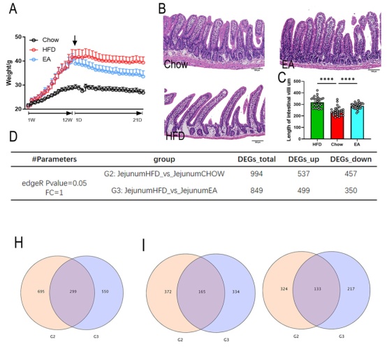 相較于HFD組,EA組顯示出顯著地減肥效果(圖2A),并減少了附睪、腎臟和腹股溝區(qū)域的脂肪堆積??漳c是腸道脂質(zhì)消化和吸收的主要區(qū)域,HFD小鼠的空腸絨毛明顯長(zhǎng)于食物組(圖2B, 2C)。HFD組和正常對(duì)照組間共鑒定出994個(gè)差異表達(dá)基因DEG(圖2D-F),HFD組和EA組共鑒定出849個(gè)DEG(圖2G);通過(guò)取兩個(gè)比較組共有的DEG,作為EA直接調(diào)控肥胖的DEG,共檢測(cè)到共有基因299個(gè),其中上調(diào)的有165個(gè),下調(diào)的有133個(gè)(圖2H-J)。