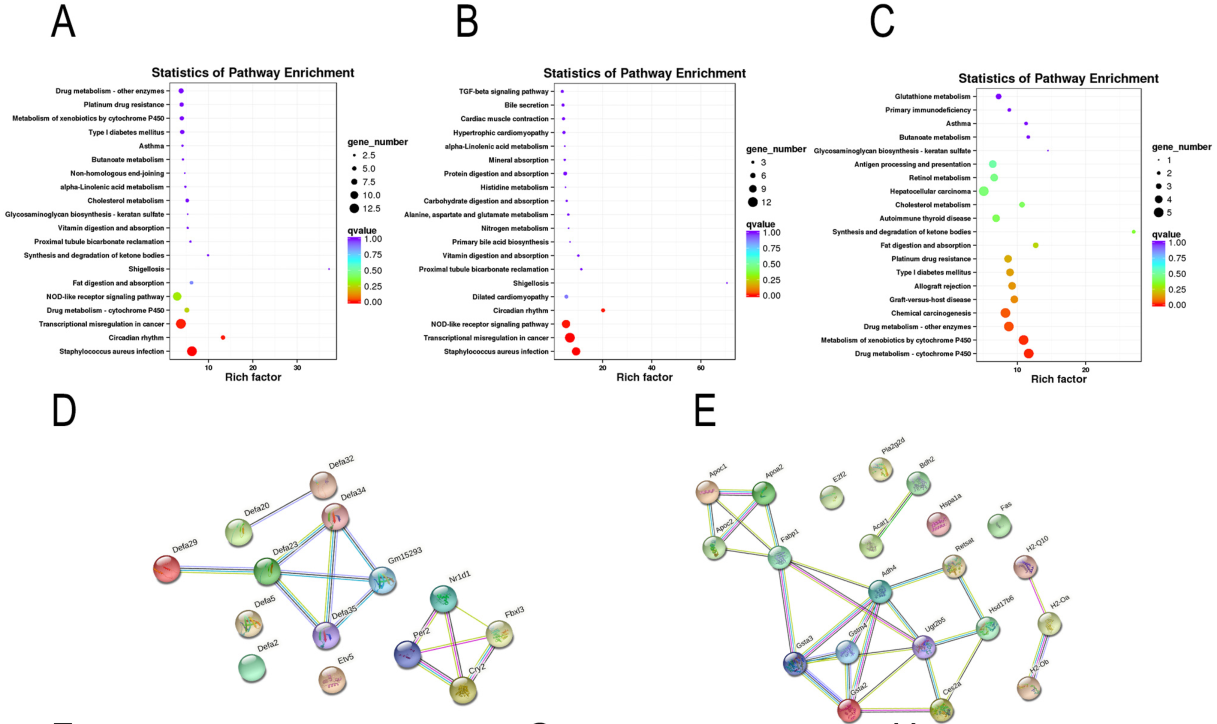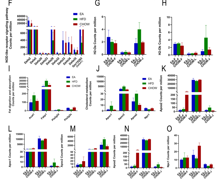 對(duì)共有DEG進(jìn)行功能富集分析,發(fā)現(xiàn)顯著富集的通路主要與宿主先天防御和脂質(zhì)代謝相關(guān)(圖3A);在去除功能未鑒定的基因或lncRNA后,獲得140個(gè)上調(diào)和92個(gè)下調(diào)的DEG也進(jìn)行功能富集分析(圖3B, 3C);然后,對(duì)top20通路的DEG進(jìn)行PPI調(diào)控網(wǎng)絡(luò)分析(圖3 D, 3E),結(jié)果顯示,EA主要上調(diào)的通路包括α防御素基因在內(nèi)的NOD樣受體信號(hào)通路(圖3 D),下調(diào)的通路脂質(zhì)代謝(包括脂質(zhì)消化和吸收途徑),以及免疫應(yīng)答相關(guān)通路(谷胱甘肽s-轉(zhuǎn)移酶和MHC II類相關(guān)基因)(圖3E)。基因表達(dá)直方圖顯示EA干預(yù)恢復(fù)大量異常表達(dá)的DEG,與腸粘膜免疫相關(guān)的DEG,如α防御素基因,可以通過(guò)EA顯著恢復(fù)(圖3F);與免疫反應(yīng)相關(guān)的H2-Ob和H2-OA僅在空腸區(qū)域下調(diào)(圖3G, 3H);EA干預(yù)恢復(fù)了fabp1、pla2g2d和acat1的表達(dá)水平,主要負(fù)責(zé)脂肪消化和吸收(圖3I);最后,EA干預(yù)通過(guò)下調(diào)apoc1、apoa2和apoc2以及上調(diào)npc1來(lái)調(diào)節(jié)膽固醇代謝(圖3J-O)。