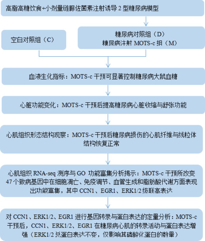 心臟重構和功能障礙是糖尿病常見的并發癥,常導致嚴重的心血管事件。MOTS-c是一種線粒體衍生肽,通過加速葡萄糖攝取和提高胰島素敏感性來調節代謝穩態。目前發現,MOTS-c不僅可改善心臟與血管內皮功能,且其含量在糖尿病患者血漿中明顯下降,使其成為糖尿病心血管并發癥的一個新的治療靶點。所以,該研究旨在探究MOTS-c對糖尿病心臟結構與功能的影響并利用轉錄組學技術挖掘其中的分子機制。