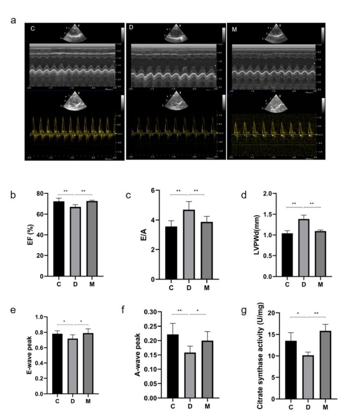 該研究利用透射電鏡測定了MOTS-c對糖尿病心肌超微結構的影響。糖尿病引起心肌纖維排列紊亂和線粒體結構的異常改變,包括心肌細胞排列不規則、嵴破裂、腫脹和空泡化(圖2)。MOTS-c治療糖尿病大鼠顯著降低心肌線粒體損傷,改善心肌纖維和線粒體結構(圖2)。研究還通過測定檸檬酸合酶的活性,測定了線粒體功能。D組大鼠檸檬酸合酶的活性顯著降低,C組和M組的檸檬酸合酶的活性無統計學差異(圖3g)。