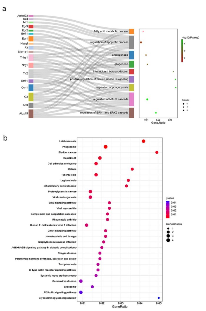 采用Gene Ontology(GO)與Kyoto Encyclopedia of Genes and Genomes(KEGG)對MOTS-c所改變的47個致病基因進行功能富集分析。GO 注釋系統包含三個主要分支,即:生物學過程(BP)、分子功能(MF)和細胞組分(CC)。)8 周 MOTS-c 注射所改變的 47 個糖尿病致病基因共富集于 195 個 GO term 中,其中 188 個 term 富集于 BP,2 個 term 富集于 CC,5 個 term 富集于MF。經過 ClueGO 聚類分析后,195 個 term 主要富集于 9 個類別(見圖 5b),分別為血管生成(angiogenesis)、凋亡過程調控(regulation of the apoptotic process)、MAPK 級聯調控(regulation of MAPK cascade)、蛋白激酶活性正調控(positive regulation of protein kinase activity)、脂肪酸代謝過程(fatty acid metabolic process)、吞噬作用調節(regulation of phagocytosis)、蛋白激酶 B 信號正調控(positive regulation of protein kinase B signaling)、ERK1/2 級聯(regulation of ERK1/2 cascade)、膠質生成(gliogenesis)和白細胞介素-1 的產生(interleukin-1 beta production)。KEGG通路富集分析顯示,18條KEGG通路顯著富集(圖5b),其中5條信號通路與免疫、凋亡和糖代謝相關(ErbB信號通路、補體和凝血級聯、c型凝集素受體信號通路、PI3K-Akt信號通路和AGE-RAGE信號通路)。在功能富集通路注釋基因中,ALOX15、ATF3、CCN1、EGR1、EGR3、ERRFI1、THBS1、TLR2和NRG1高頻率注釋。CCN1與EGR1基因高表達,同時均注釋在凋亡相關的GO term中,而CCN1也注釋于富集顯著性最高的ERK1/2級聯通路中,表明CCN1、ERK1/2與EGR1可能是相互關聯的關鍵基因。