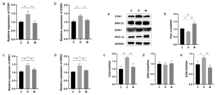 為了驗證CCN1、ERK1/2與EGR1是否在MOTS-c改善糖尿病心臟結構與功能中發揮重要作用,也為了進一步探究MOTS-c對線粒體發生的作用,研究者利用RT-PCR與Western Blotting技術測定了CCN1、ERK1/2、EGR1的基因表達與蛋白表達以及線粒體發生標志蛋白PGC-1α的蛋白表達。結果表明,MOTS-c治療后,糖尿病大鼠心肌中PGC-1α蛋白表達顯著上升(圖7a);CCN1、ERK1/2和EGR1基因表達顯著降低(圖6);CCN1、EGR1蛋白表達顯著降低,ERK1/2的總蛋白表達量不變(圖7),但多個研究表明MOTS-c僅影響ERK1/2的磷酸化水平。