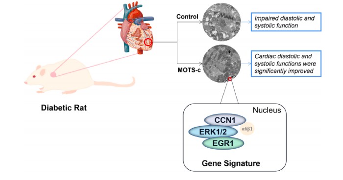 為期8周的MOTS-c治療減少了糖尿病患者的心功能障礙與線粒體損傷,MOTS-c可能是通過調節脂肪酸代謝、免疫調節、血管生成和細胞凋亡產生作用。CCN1/ERK1/2/EGR1的信號轉導可能在MOTS-c抑制心肌細胞凋亡中發揮重要作用。