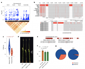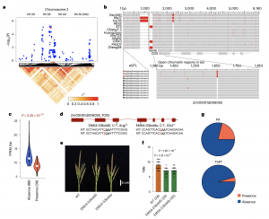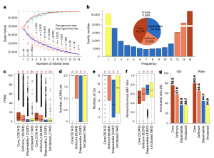 隨后,作者使用RNA-seq數據進一步研究了不同pan-gene的表達譜。總體表達豐度情況從核心、軟核心到可變基因逐漸降低,表明核心基因具有穩定和更廣泛的表達譜,而可變基因具有較低水平、組織特異性、品系特異性或條件依賴性表達。核心基因編碼區中非同義變與總突變的比率低于軟核心和可變基因(圖2f)。可以注釋的基因比例從核心、軟核心到可變基因逐漸減少(圖2g)。以上結果表明,核心基因在進化上更加保守。