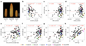之前研究報道了雜種優勢與分子遺傳距離(GD)存在弱正相關關系。本研究為了研究產量雜種優勢與遺傳變異之間的關系,首先將基因組劃分為共線性和和非共線性區域。相關分析顯示,共線性區域長度與GYPP的BPH呈顯著負相關(圖5b)。共線性區域的SNPs和small InDels僅與GYPP的BPH呈弱相關 (圖5c和5d)。相反,非共線性區域長度、SV_Number和PAV_Number均與GYPP的BPH呈顯著正相關(圖5e-g)。其中,SV_Number與GYPP雜種優勢表現出強的相關性(圖5f)。SVs可以進一步分為插入或缺失、串聯收縮擴張和重復收縮擴張。其中,插入缺失與GYPP雜種優勢的相關性強。綜上所述,表明SVs的數量對GYPP的貢獻很顯著,支持了SVs在雜種優勢中起主導作用這一觀點。