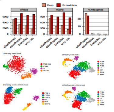 主要結果:a.?snRNA-seq增加內含子序列分析可以達到scRNA-seq一致的靈敏度