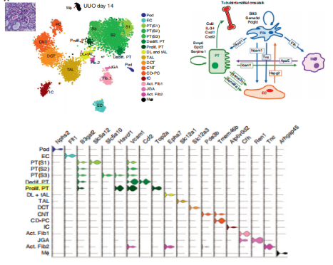 利用?10x Chromium?snRNA-seq對6147單細胞核分析經過纖維化和炎癥UUO治療第14天冷凍腎組織,鑒定了增殖近端小管細胞、去分化近端小管和腎小球旁細胞;推測了未知的腎小管間質信號通路(圖3-3)。