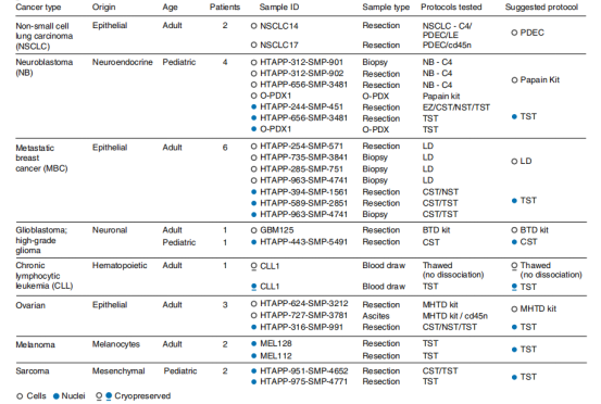實驗材料:新鮮和凍存的8種腫瘤組織,如NSCLC(非小細胞肺癌), ?NB(成神經細胞瘤),MBC(轉移性乳腺癌),GBM(腦膠質瘤),CLL(慢性淋巴細胞白血病),Ovarian(卵巢癌),Melanoma(黑色素瘤)和肉瘤。