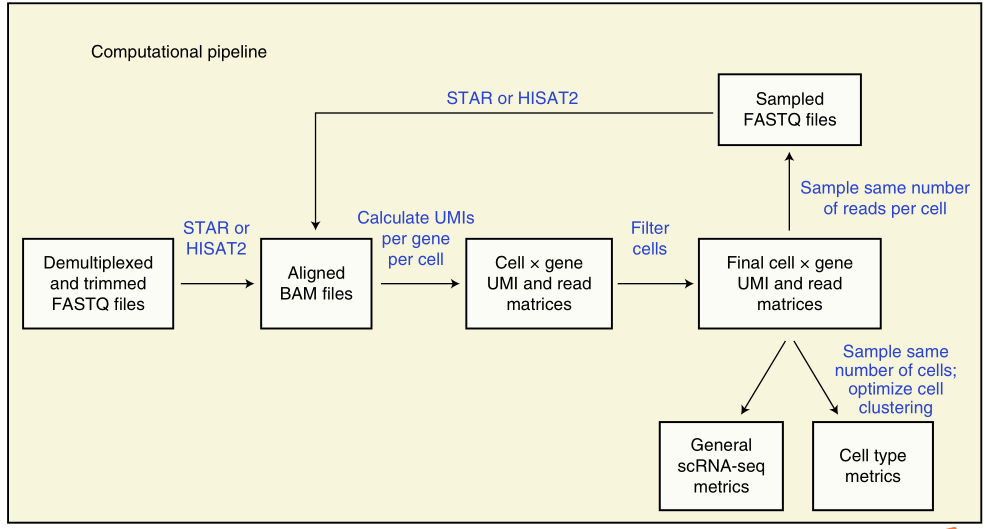 首先,開發了“scumi”軟件包,從FASTQ文件到產生適用下游分析的基因和細胞參數;其次,提出了下游分析前過濾低質量細胞的方案,這也是數據預處理的重要挑戰,然后對每個實驗類型每個細胞進行相同的reads數分析;最后,通過關鍵的參數對每種方法進行評估:①比對到細胞核和線粒體基因組的reads 及其結構;②捕獲RNA的靈敏度;③多胞率;④準確性和重復性;⑤得到細胞類型中重要的生物學差異的能力(圖2-1)。