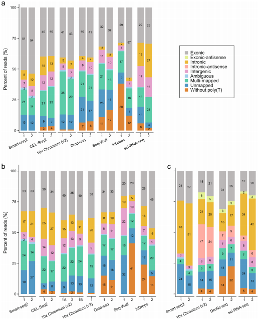 b.?reads結構和比對到基因組的信息顯示不同方法具有效率差異結果顯示,不同的方法在預期的位置沒有Poly(T)reads比例明顯不同;外顯子、內含子、基因間、重疊的差異基因、多重比對以及無法比對的reads不同方法間基本一致;但是細胞核中內含子reads與外顯子reads的比率明顯高于細胞,因為細胞核中有較高比例未剪切的轉錄本(圖2-2)。