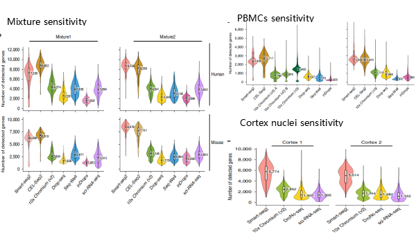 結通過分析每個細胞的reads數、UMIs 和基因數比較每種方法的靈敏度(即捕獲RNA的能力);7種方法中,低通量方法靈敏度最高,高通量方法中10x Chromium 每個細胞檢測到的UMI和基因數最多(圖2-3)。
