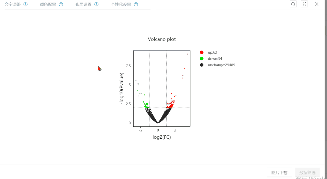 做完細(xì)胞聚類cluster之間的差異基因分析后,可通過火山圖查看基因的表達(dá)情況。可查看火山圖中點對應(yīng)的基因,樣式可自定義。