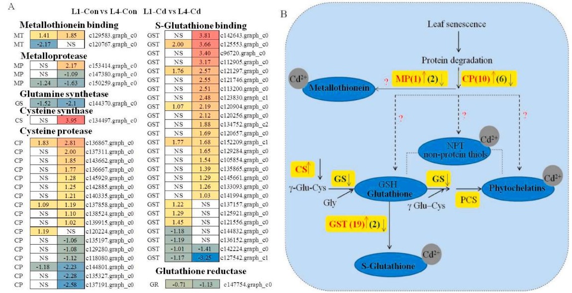 MT(金屬硫蛋白)是一組金屬結合蛋白,在金屬分配和穩態中起著關鍵作用。1個上調基因(c129583.Graph_c0)和一個下調基因(c120767.graph_c0)編碼MT。Cd脅迫使上調基因的差異倍數比對照增加了23.8%,并完全抑制了表達下調的基因。結合Cd脅迫下MT含量的增加,作者的研究結果表明,MT-Cd結合可能在幼葉(L1)和衰老葉片(L4)的Cd解毒過程中發揮作用。半胱氨酸蛋白酶(CPs)是葉片衰老過程中負責蛋白水解活性的最豐富的酶。在該轉錄組中鑒定出17個編碼CP的基因。在對照組中,只有4個基因的表達有顯著差異。Cd脅迫顯著促進CP表達,有10個上調基因在Cd處理組的差異倍數高于處理組,Cd處理組的6個基因下調倍數低于對照組。然而,PC的蛋白水解活性是否與衰老葉片中Cd的積累有關尚不清楚。