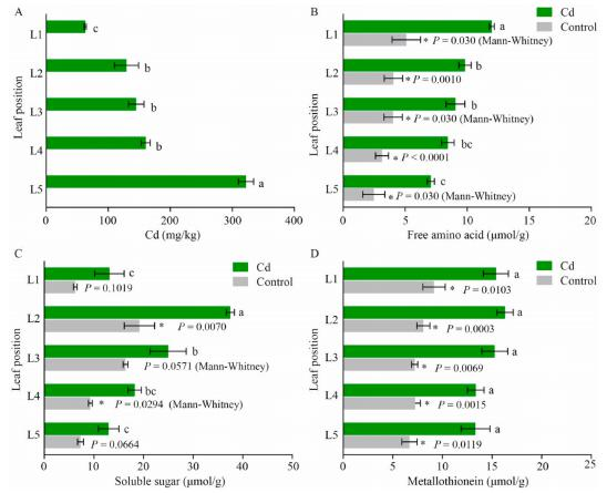 不同葉片Cd積累量顯著不同。葉片Cd濃度隨葉片數量的增加從上到下顯著增加,L2、L3、L4和L5的Cd濃度比幼葉(L1)增加了2.1、2.3、2.5和5.1倍。幼葉(L1)積累Cd最少,而衰老葉(L5)積累Cd最多。Cd處理顯著提高了各葉片游離氨基酸含量,但沒有改變其隨葉片衰老逐漸下降的趨勢,幼葉中游離氨基酸含量(L1)最高,然后隨著葉片衰老逐漸降低(圖1B)。衰老葉(L5)中游離氨基酸含量最低。成熟葉片中可溶性糖含量(L2)最高,Cd處理顯著提高了L2和L4的可溶性糖含量,然后隨著葉片衰老逐漸降低。衰老葉(L5)和幼葉(L1)的可溶性糖含量顯著低于綠色成熟葉。鎘脅迫下,與對照組相比,Cd處理顯著提高了所有葉片中的金屬硫蛋白含量,不同葉片金屬硫蛋白含量無顯著變化。