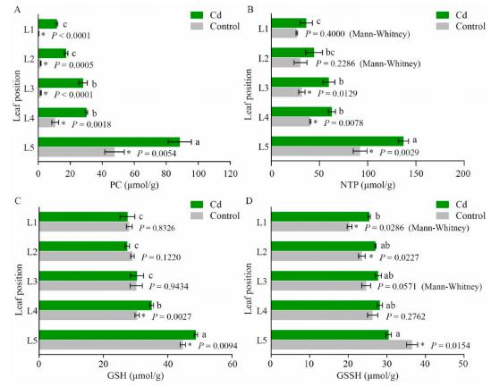 PC、GSH和NPT參與了超積累劑的Cd解毒機。Cd脅迫和對照組的植物螯合素(PCs)均隨葉片老化顯著增加。Cd處理顯著提高了各葉片PC含量,非蛋白硫醇(NPTs)含量也隨著葉片衰老而顯著增加,但隨葉片衰老的增加趨勢沒有變化。Cd處理顯著增加了衰老葉片(L4和L5)的谷胱甘肽(GSH)含量,但沒有提高幼苗和成熟苗的GSH含量。由此可以推斷,GSH、PC和NPT的增加及其與Cd的結合可能促進了衰老葉片中Cd的積累。Cd處理顯著增加了幼葉和成熟葉的氧化谷胱甘肽(GSSH)含量(L1和L2),但降低了衰老葉(L5)的GSSH含量。由于氧化后的谷胱甘肽(GSSH)可被還原為還原型谷胱甘肽(GSH),還原性谷胱甘肽(GSH)可以通過GST進一步催化GSH-Cd結合,GSSH向GSH的轉化與Cd在衰老葉片中的積累是一致的。