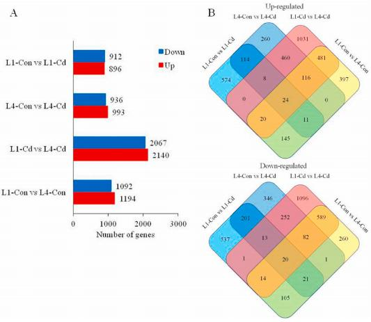 為了了解差異基因的功能,作者進行了GO富集分析。四組的差異基因在節律過程、信號傳導和代謝過程等生物過程中都有20個豐富的分類。值得注意的是,與對照組相比,脫毒組的差異基因在幼葉和衰老葉中都有富集(L1-ConvsL1-Cd和L4-ConvsL4-Cd),但在幼葉和衰老葉的對照組和處理組中沒有明顯富集(L1-CdvsL4-Cd和L1-ConvsL4-Con)。
