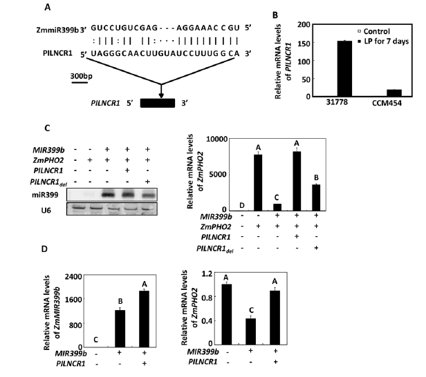 圖5:PILNCR1對ZmmiR399誘導的ZmPHO2切割的影響。A,玉米中PILNCR1與miR399b之間的互補區域示意圖;B,RT-qPCR實驗驗證在p缺乏條件下的磷高效玉米CCN454和磷低效玉米31778中PILNCR1的表達;C,本氏煙中miR399、ZmPHO2、PILNCR1和PILNCR1del不同組合的共表達;D,玉米葉片原生質體中miR399和PILNCR1組合的共表達