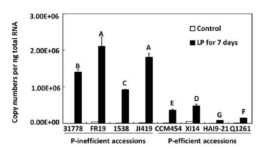 為了進一步調查玉米低磷脅迫時PILNCR1的功能,我們通過RT-qPCR,檢測在磷高效玉米(CCM454、X114、HAI9-21、Q1261)和磷低效玉米(31778、FR19/1538、J1419)中PILNCR1的表達量。在pi缺乏條件下,在磷高效株和磷低效株中PILNCR1的表達量都是低的,見圖7。然而,當玉米收到低P脅迫7天后,磷低效玉米株中的PILNCR1的表達量是磷高效株中的6倍。