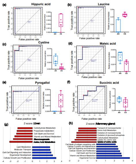 MG中的馬來酸(AUC=0.972,log2FC=-2.88;圖3d),鄰苯三酚(AUC=0.833,log2FC=6.26;圖3e)和琥珀酸(AUC=0.833,log2FC=-3.01;圖3f)是分離AH和CS動物的潛在生物標記。通過IPA識別,CS喂養的奶牛的肝臟中關鍵顯著下調的途徑是氨基酸(AA)代謝(P=1.66E-07,Z評分=-3.12),糖異生(P=3.86E-08,Z評分=-2.61))以及肝臟中的維生素和礦物質代謝(P=1.47E-15,Z分數=-2.42)(圖3g);MG中AAs的攝取(P=1.49E-08,Z分數=-2.77),攝取L-AA(P=4.52E-07,Z分數=-2.41),碳水化合物代謝(P=2.10E-11,Z分數=-2.24)和葡萄糖-6-磷酸的氧化(P=1.01E)-11,Zscore=-2.21)途徑顯著下調。(圖3h)