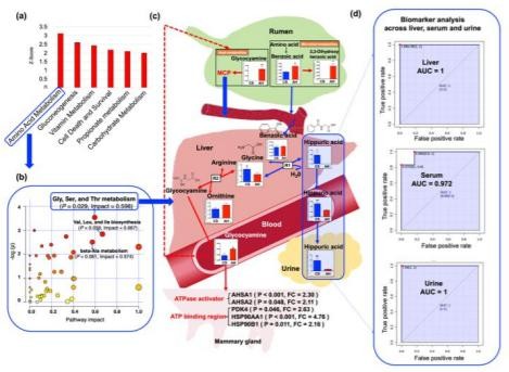 在兩個動物組之間,AA代謝途徑是肝臟中最顯著不同的途徑(圖5a)。對AA代謝途徑的進一步影響分析表明,亞途徑,甘氨酸,絲氨酸和蘇氨酸代謝的影響較大(圖5b,P=0.029,影響值=0.597)。因此,我們對肝臟中與甘氨酸相關的反應進行了徹底的分析,并研究了它們與體內體液中代謝物的關系。綜合比較表明,苯甲酸,糖胺(GAA)和HCA在整個人體的AA代謝中起著關鍵作用,當母牛飼喂CS時,隨后會影響牛奶的合成(圖5c)。用CS喂養的奶牛肝臟中甘氨酸和HCA的濃度更高,進一步支持了我們的推測,即瘤胃(微生物)和肝臟(宿主)中的苯甲酸代謝都可能受到影響(圖5c)。對肝,血清和尿液進行的HCA生物標志物分析顯示出一致的結果(圖5d),這進一步表明,從肝臟到尿液的HCA循環是CS下牛奶產量變化的生物標志物。
