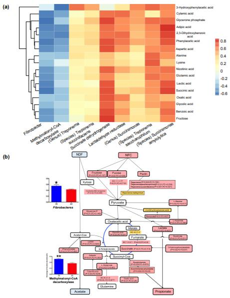 瘤胃液中55種明顯不同的代謝產物中,CS喂養的動物中49種的代謝產物含量較低,通過將微生物分類群相對豐度,碳水化合物代謝中的基因豐度和17種高度豐富的微生物代謝物相關聯,研究了微生物代謝物與微生物之間的關系。核心宏基因組相關元素包括三個細菌屬(纖維桿菌,琥珀酸桿菌和螺旋體)),三種細菌種類(解淀粉琥珀酸桿菌,琥珀酸梅毒螺旋體和嗜糖鏈球菌)和三種微生物功能(甲基丙二酰輔酶A脫羧酶,琥珀酸脫氫酶和乳醛還原酶)(圖2a)。琥珀酸脫氫酶基因和解淀粉鏈球菌的相對豐度分別與16種代謝物(r介于0.43至0.68,P<0.1)和15種代謝物(r介于0.43至0.76,P<0.1)呈正相關。對上述瘤胃代謝組和代謝組的綜合分析顯示,當給動物喂食CS時,瘤胃中產生較低的丙酸根和較高的乙酸鹽的潛在機理(圖2b)。