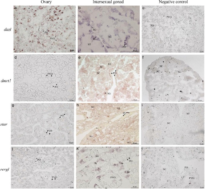 用原位雜交(ISH)技術(shù)分析了不同性腺階段性相關(guān)基因(dazl、Dmrt1、star、rergl)的定位。dazlmRNA僅限于斜帶石斑魚的雌性和雄性生殖細(xì)胞(卵母細(xì)胞、SG和SC)表達(dá)(圖9a、b),結(jié)果表明dazl是一種生殖細(xì)胞標(biāo)記物,在睪丸中高表達(dá),這與其他物種中dazl的表達(dá)一致。在自然雌性的卵巢中未檢測(cè)到Dmrt1信號(hào)(圖9d)。性逆轉(zhuǎn)后期的性腺有豐富的雄性生殖細(xì)胞SG、SC和ST,帶有dmrt1陽(yáng)性信號(hào),而卵母細(xì)胞沒有dmrt1信號(hào)(圖9e),因此dmrt1可以被認(rèn)為是斜帶石斑魚的生殖細(xì)胞標(biāo)記。star作為合成類固醇激素途徑中的限速酶,其在雄性斜帶石斑魚的睪丸中特異表達(dá),而在卵母細(xì)胞中未檢測(cè)到star信號(hào)(圖9g)。此外,發(fā)現(xiàn)starmRNA在SG、SC和ST中表達(dá)(圖9h)。rerglmRNA僅在雄性生殖細(xì)胞中檢測(cè)到(圖9j,k),這與RT-qPCR結(jié)果一致,暗示其在性別調(diào)節(jié)中的潛在作用。dazl、dmrt1、star和rergl的雜交探針作為對(duì)照實(shí)驗(yàn)顯示性腺中沒有信號(hào)(圖9c、f、I、l)。