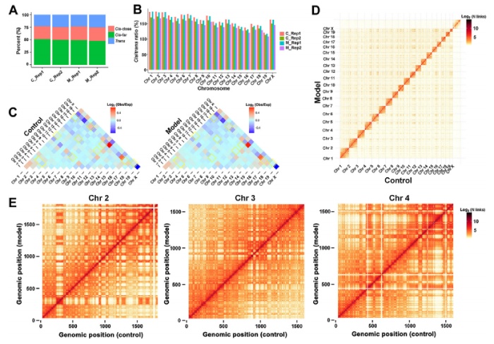 為了獲得三維染色質構象圖,作者對肝臟樣本的Hi-C文庫進行了測序,每組總共獲得超過477 Gb的數據。在去除PCR重復位點后,每個樣本獲得了超過8.02億對有效Hi-C數據,測序深度為68.56%和68.96%,能夠以10 kb分辨率檢查C組和M組的相互作用。順反式相互作用的比例顯示,約四分之三的相互作用發生在染色體內,四分之一的相互作用發生在染色體間質(圖2A)。,這個頻率可以揭示染色體在基因組中的相互作用強度和染色體在細胞核中的相對位置。染色體之間的相互作用頻率熱圖如圖2C所示。通過熱圖顏色由對照組的藍色變為NAFLD組的淺紅色,可以發現染色體Chr2與Chr5之間相互作用頻率的差異,提示NAFLD組兩染色體之間距離較近,相互作用較強。相比之下,觀察到的顏色從紅色變為藍色,表明NAFLD組染色體之間的空間距離更遠,相互作用更弱,如Chr 7和Chr 11之間的相互作用。將各組的兩個Hi-C庫結合起來,進行對照組與模型組的對比分析。根據任意兩個bin之間覆蓋的Hi-C讀對的歸一化相互作用信號強度,繪制全基因組相互作用矩陣(圖2D),染色體內相互作用矩陣如圖所示。