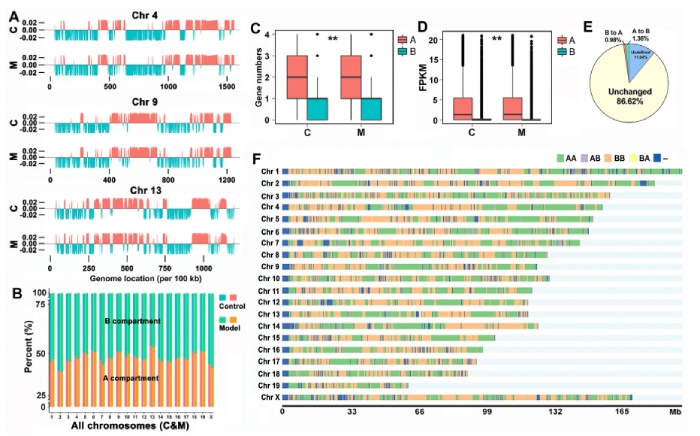 圖3通過Hi-C和RNA-seq檢測NAFLD小鼠肝臟A/B區及相關DEGs的變化。