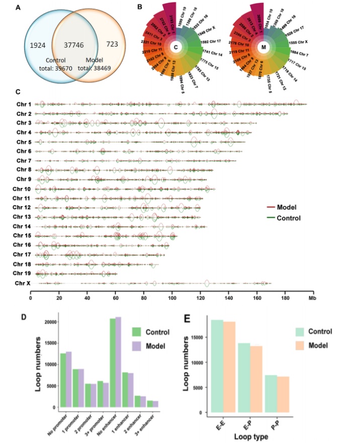 除了短程染色質相互作用外,3D基因組組織中的遠程環帶來了兩個線性分離的位點之間的物理接近。作者通過Hi-C接觸矩陣使用改進的HICCUP方法注釋染色質環,分辨率為10 kb。結果顯示,與NAFLD發展相關的環的總數減少(從39,670到38,469,圖5A),而環的大小沒有變化(環的中位數長度為70 kb,支持信息圖S6A。每條染色體的環分布如圖5B和C所示,Chr 1上的環分布*多,對照組和模型組分別有3193個和3099個環(圖5B)。