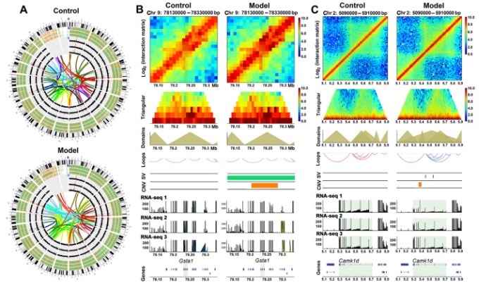 非酒精性脂肪性肝病(NAFLD)的3D基因組和基因組變異在很大程度上是未知的,盡管它們在細胞功能和生理過程中起著關鍵作用。在正常和NAFLD小鼠的肝臟上進行高通量染色體構象捕獲(Hi-C)、ONT測序和rna測序(RNA-seq)測定。生成高分辨率3D染色質相互作用圖,通過Hi-C檢測不同的3D基因組層次結構,包括A/B區室、拓撲相關結構域(TADs)和染色質環,并檢測結構變異(SVs)和拷貝數變異(CNVs)的全基因組測序。在正常和NAFLD小鼠間,發現了基因組中數千個區域在3D染色質組織和基因組重排方面的變化,并揭示了基因調節異常經常伴隨這些變化。在NAFLD中發現了候選靶基因,受基因重排和空間組織破壞的影響。作者的數據為NAFLD研究提供了高分辨率的三維基因組相互作用資源,揭示了遺傳重排、空間組織破壞和基因調控之間的關系,并確定了與NAFLD發病機制中這些變異相關的候選基因。這些新發現為NAFLD的發病機制提供了新的見解,并為NAFLD的治療提供了新的概念框架。