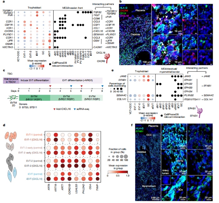 下一步作者通過scRNA-seq和snRNA-seq,以及單分子熒光原位雜交(smFISH)技術,驗證了dNK通過多個配體-受體對與EVTs相互作用,且這些受體在EVT-2處表達上調。以及iEVTs通過與EFNB1結合的子宮肌層平滑肌細胞(uSMCs)特異性表達EPHB1和EPHB4從蛻膜遷移到子宮肌層;且EFNB1在iEVT和GCs中明顯上調。