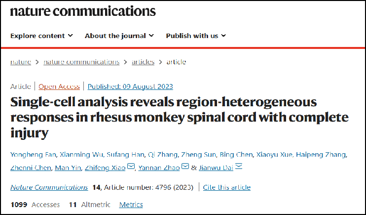 作者通過對構建的胸段全橫斷脊髓損傷恒河猴模型進行了單細胞轉錄組測序,深入解析了完全性脊髓損傷近端和遠端不同區域的細胞動態變化。并進一步研究了膠原材料支架移植對完全性脊髓損傷不同區域的治療效應和機制。