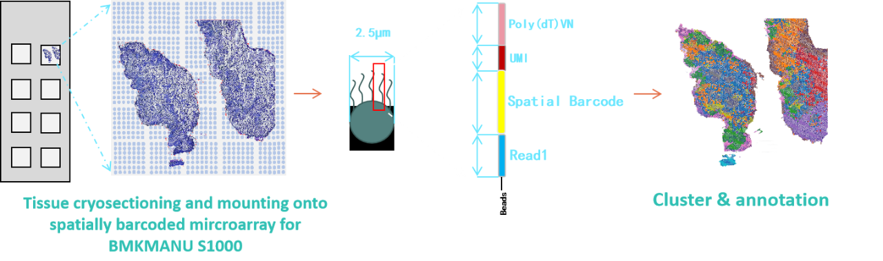百創智造BMKMANU S系列空間轉錄組芯片是基于微孔微珠的亞細胞級空間轉錄組產品,最高分辨率4.8μm ,并開創性的將組織原片H&E染色,原片熒光染色及原片高通量測序相結合進行精準的細胞分割,實現精準的單細胞級空間轉錄組測序,極大地推動了基礎科研發展,目前在發育疾病、生理學疾病、胚胎發育、干細胞分化、繪制3D圖譜、生殖健康、腫瘤等領域廣泛應用。