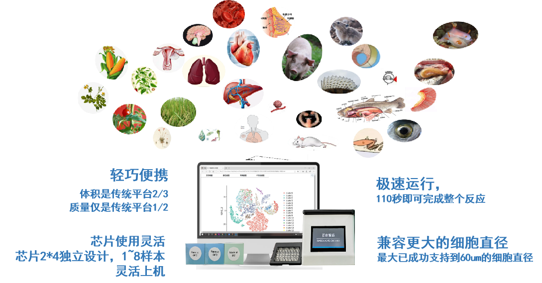 百創智造自主研發的單細胞平臺–百創DG1000,是基于微流控、油滴包裹和Barcode標記等技術來實現高通量的細胞捕獲。除了儀器以外,百創DG1000還有配套的2×4的獨立芯片、GEM形成試劑盒、純化試劑盒、以及建庫試劑盒。